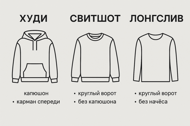 Основные отличия: худи, свитшот и лонгслив