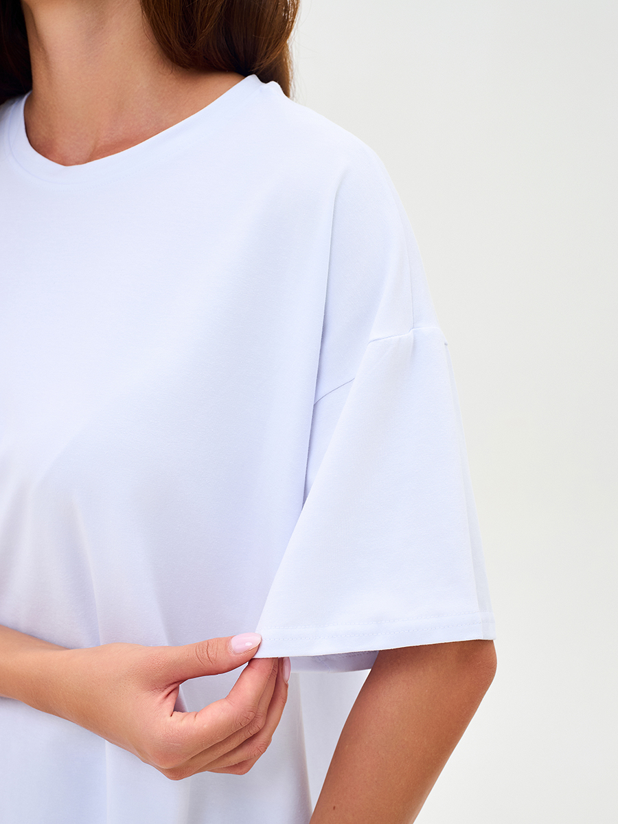 Oversize крой, спущенная линия плеча и расслабленный силуэт дарят свободу движений и создают чувство лёгкости. Классическая круглая горловина подчеркивает универсальность модели, делая длинную футболку идеальной для повседневного ношения.